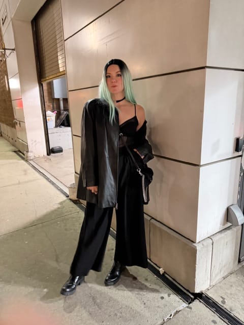 I knew this was my opporutnity to really play dress up and go for it! So along with my wig, I wore a mesh top, a black trouser that everyone needs, they truly go with everything always (from amazon, ugh I know!), and one of my most-loved thrifted items, a tuxedo blazer by House of Harlow that I picked up at Newburgh Vintage Emporium, layered with a men’s leather jacket I bought at Red, White, & Thrift for $30!
