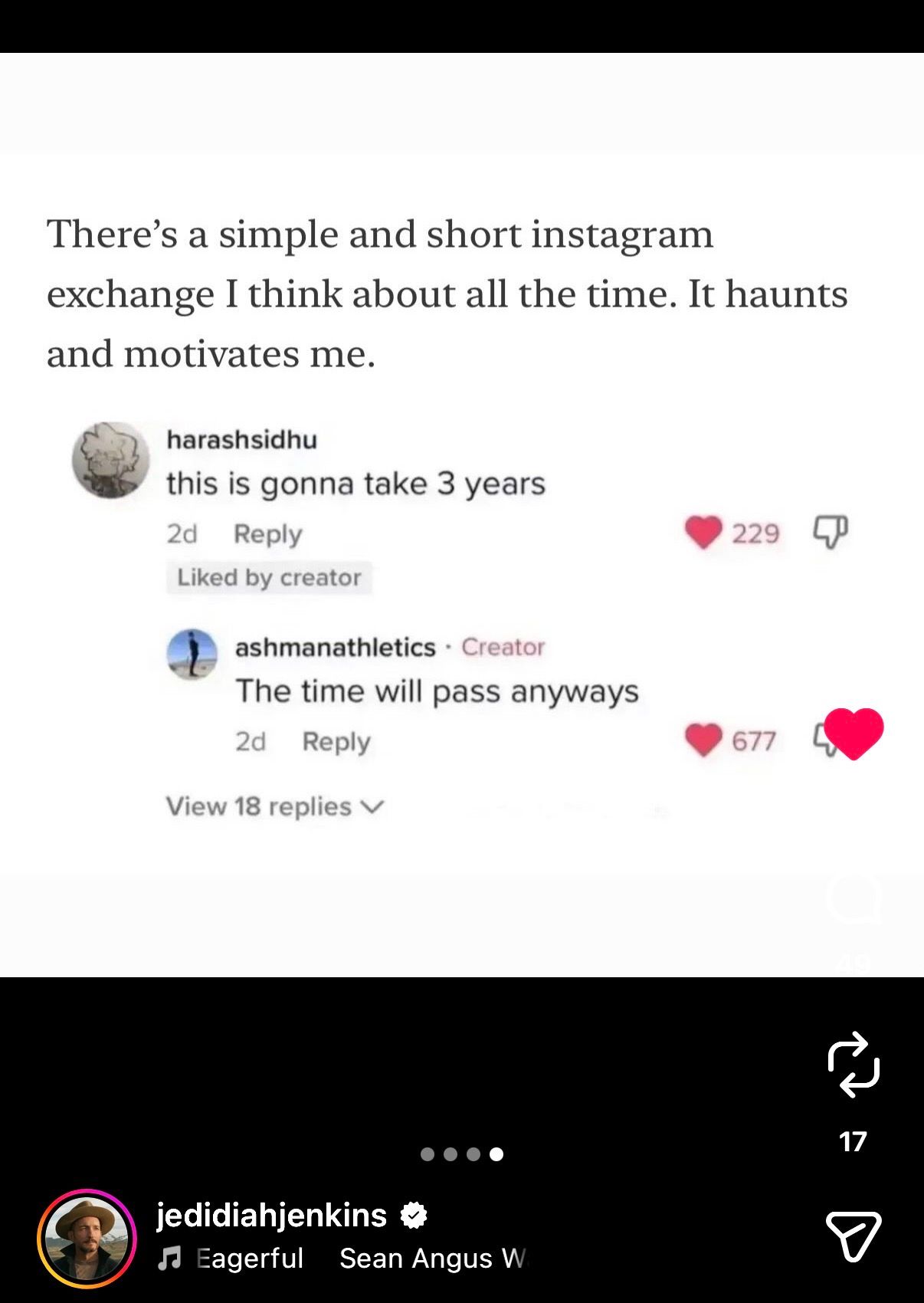 We had no idea how or if it would work, but we just built what we wanted to go to. So the biggest lesson in all of this: if it’s something you wish existed, something you’d be excited to show up for, wear, use, or experience, it’s probably worth trying. I saw this quoted exchange in an instagram account I love Jedidiah Jenkins -